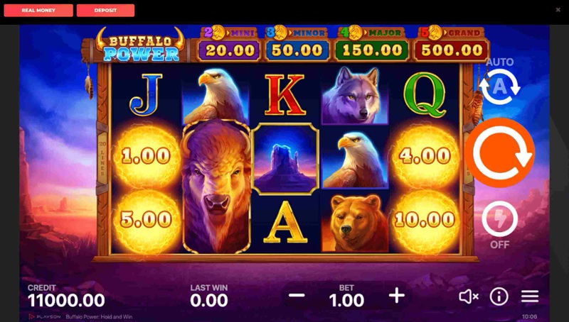 У тесті слоту Buffalo Power: Hold and Win, від Playson, була налаштована демораундер з 700$ стартовим банкролом. Користувач має можливість змінити роздільні здатності бойового екрану та ставити віртуальні гроші на кожен спін звичайним або автоматичним способом.