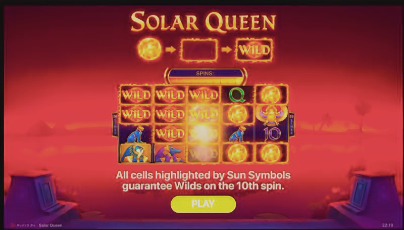 Solar Queen приурочена до народу і міфології стародавнього Єгипту. Вранці слота прикрашають яскраві та глибокі кольори, основними забарвленнями є блакитне та золоте.