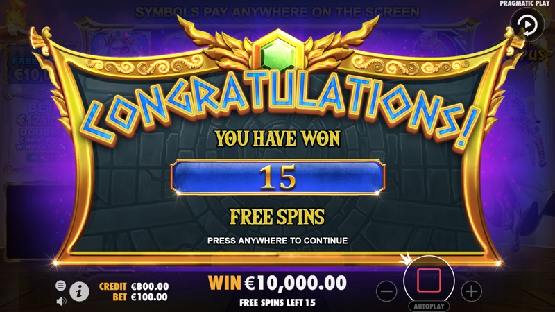 Друга ключова бонусна функція — фріспіни. Для того, щоб вони відкривалися, вам потрібно відбити чотири або більше символів Зевса. Ви одержите 15 безкоштовних спінів, а множники падають на барабани, вони додаються до середнього множника. Це робить ваш потенційний виграш дуже великим. Фріспіни є найбажанішою функцією, бо саме з їх допомогою зазвичай оплачуються найбільші виграші. Я 2-3 рази попадав до цих раундів і здивований їхнім різницёю.
